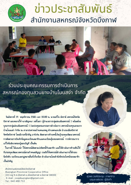 วันอังคารที่ 14 พฤศจิกายน 2566 เวลา 10.00 น. นายอภิไท มังธานี สหกรณ์จังหวัดบึงกาฬ มอบหมายให้ นางสัญทนา วงศ์โสภา ผู้อำนวยการกลุ่มส่งเสริมสหกรณ์ 1 พร้อมด้วย บุคลากรกลุ่มส่งเสริมสหกรณ์ 1 ร่วมประชุมคณะกรรมการดำเนินการ สหกรณ์กองทุนสวนยางบ้านโนนสง่า จำกัด ณ ศาลาประชาคมบ้านหนองหมู ตำบลหนองเลิง อำเภอเมืองบึงกาฬ จังหวัดบึงกาฬ โดยมีวาระที่สำคัญ อาทิเช่น ติดตามการชำระหนี้เงินกู้กองทุนพัฒนาสหกรณ์ การติดตามการบันทึกข้อมูลทะเบียนสมาชิกและทะเบียนหุ้นของสหกรณ์ การพิจารณาการแก้ไขข้อสังเกตของผู้สอบบัญชี เป็นต้น
