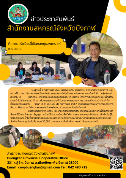 วันศุกร์ ที่ 9 กุมภาพันธ์ 2567 นางพิชญ์สิณี สว่างโรจน์ สหกรณ์จังหวัดบึงกาฬ มอบหมายให้ นางสาวธีมาพร พรมเรียน นักวิชาการสหกรณ์ปฏิบัติการ พร้อมคณะ และเจ้าหน้าที่กลุ่มส่งเสริมสหกรณ์ 3 เข้าติดตาม เร่งรัดหนี้เงินกองทุนสงเคราะห์เกษตรกร โครงการสนับสนุนเงินทุนเพื่อสร้างระบบน้ำในไร่นาของสมาชิกสถาบันเกษตรกร ระยะที่ 2 ของสหกรณ์กองทุนสวนยางหัวแฮต-ป่าก่อ จำกัด ที่จะครบกำหนดชำระงวดที่ 3 ภายในวันที่ 28 กุมภาพันธ์ 2567 โดยสมาชิกได้รับบริการตามโครงการ จำนวน 10 ราย ณ ที่ทำการสหกรณ์ฯ ตำบลหัวแฮต อำเภอเซกา จังหวัดบึงกาฬ