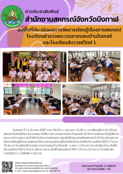วันจันทร์ ที่ 11 มีนาคม 2567 เวลา 09.30 น. และเวลา 13.00 น. นางพิชญ์สิณี สว่างโรจน์ สหกรณ์จังหวัดบึงกาฬ มอบหมายให้นางสาวจรรยาภรณ์ คำคุณศรี นักวิชาการสหกรณ์ปฏิบัติการ และนางวิภาวรรณ สินโพธิ์ นักวิชาการสหกรณ์ กลุ่มจัดตั้งและส่งเสริมสหกรณ์ เข้าประเมินผลการจัดการเรียนรู้เรื่องการสหกรณ์ในภาคทฤษฎีของเด็กนักเรียนในระดับชั้นประถมศึกษาปีที่ 6 จำนวน 10 คน ณ โรงเรียนตำรวจตระเวนชายแดนบ้านไทยเสรี อ.เซกา จ.บึงกาฬ และนักเรียนในระดับชั้นประถมศึกษาปีที่ 6 จำนวน 28 คน และระดับชั้นมัธยมศึกษาปีที่ 3 จำนวน 23 คน ณ โรงเรียนสังวาลย์วิทย์ 1 อ.โซ่พิสัย จ.บึงกาฬ