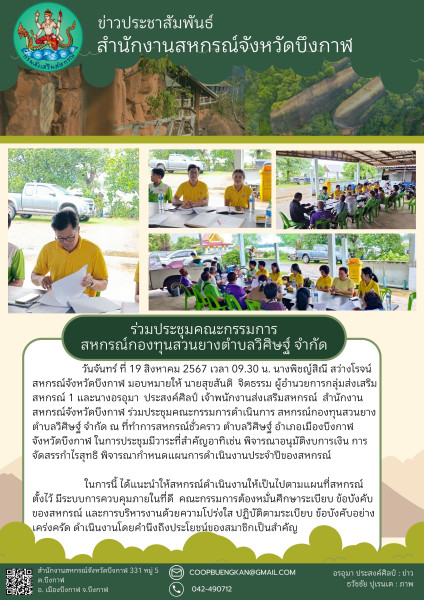 วันจันทร์ ที่ 19 สิงหาคม 2567 เวลา 09.30 น. นางพิชญ์สิณี สว่างโรจน์ สหกรณ์จังหวัดบึงกาฬ มอบหมายให้ นายสุขสันติ จิตธรรม ผู้อำนวยการกลุ่มส่งเสริมสหกรณ์ 1 และนางอรอุมา ประสงค์ศิลป์ เจ้าพนักงานส่งเสริมสหกรณ์ สำนักงานสหกรณ์จังหวัดบึงกาฬ ร่วมประชุมคณะกรรมการดำเนินการ สหกรณ์กองทุนสวนยางตำบลวิศิษฐ์ จำกัด ณ ที่ทำการสหกรณ์ชั่วคราว ตำบลวิศิษฐ์ อำเภอเมืองบึงกาฬ จังหวัดบึงกาฬ ในการประชุมมีวาระที่สำคัญอาทิเช่น พิจารณาอนุมัติงบการเงิน การจัดสรรกำไรสุทธิ พิจารณากำหนดแผนการดำเนินงานประจำปีของสหกรณ์ ในการนี้ ได้แนะนำให้สหกรณ์ดำเนินงานให้เป็นไปตามแผนที่สหกรณ์ตั้งไว้ มีระบบการควบคุมภายในที่ดี คณะกรรมการต้องหมั่นศึกษาระเบียบ ข้อบังคับของสหกรณ์ และการบริหารงานด้วยความโปร่งใส ปฏิบัติตามระเบียบ ข้อบังคับอย่างเคร่งครัด ดำเนินงานโดยคำนึงถึงประโยชน์ของสมาชิกเป็นสำคัญ