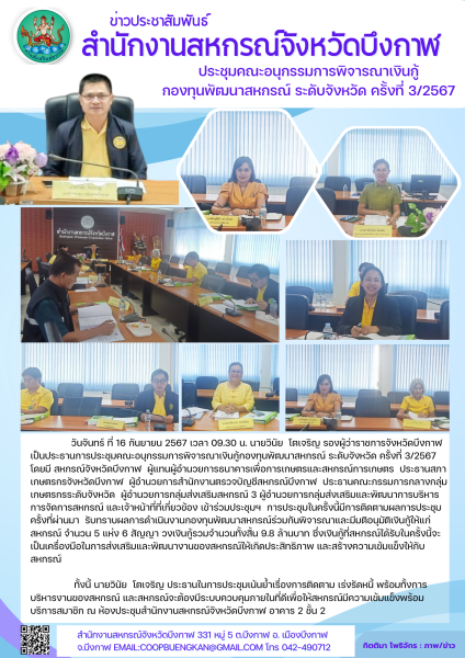 วันจันทร์ ที่ 16 กันยายน 2567 เวลา 09.30 น. นายวินัย โตเจริญ รองผู้ว่าราชการจังหวัดบึงกาฬ เป็นประธานการประชุมคณะอนุกรรมการพิจารณาเงินกู้กองทุนพัฒนาสหกรณ์ ระดับจังหวัด ครั้งที่ 3/2567 โดยมี สหกรณ์จังหวัดบึงกาฬ ผู้แทนผู้อำนวยการธนาคารเพื่อการเกษตรและสหกรณ์การเกษตร ประธานสภาเกษตรกรจังหวัดบึงกาฬ ผู้อำนวยการสำนักงานตรวจบัญชีสหกรณ์บึงกาฬ ประธานคณะกรรมการกลางกลุ่มเกษตรกรระดับจังหวัด ผู้อำนวยการกลุ่มส่งเสริมสหกรณ์ 3 ผู้อำนวยการกลุ่มส่งเสริมและพัฒนาการบริหารการจัดการสหกรณ์ และเจ้าหน้าที่ที่เกี่ยวข้อง เข้าร่วมประชุมฯ การประชุมในครั้งนี้มีการติดตามผลการประชุมครั้งที่ผ่านมา รับทราบผลการดำเนินงานกองทุนพัฒนาสหกรณ์ร่วมกันพิจารณาและมีมติอนุมัติเงินกู้ให้แก่สหกรณ์ จำนวน 5 แห่ง 6 สัญญา วงเงินกู้รวมจำนวนทั้งสิ้น 9.8 ล้านบาท ซึ่งเงินกู้ที่สหกรณ์ได้รับในครั้งนี้จะเป็นเครื่องมือในการส่งเสริมและพัฒนางานของสหกรณ์ให้เกิดประสิทธิภาพ และสร้างความเข้มแข็งให้กับสหกรณ์