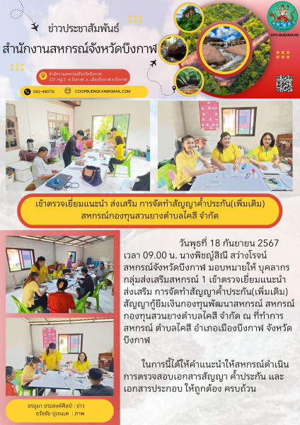 วันพุธที่ 18 กันยายน 2567 เวลา 09.00 น. นางพิชญ์สิณี สว่างโรจน์ สหกรณ์จังหวัดบึงกาฬ มอบหมายให้ บุคลากรกลุ่มส่งเสริมสหกรณ์ 1 เข้าตรวจเยี่ยมแนะนำ ส่งเสริม การจัดทำสัญญาค้ำประกัน(เพิ่มเติม) สัญญากู้ยืมเงินกองทุนพัฒนาสหกรณ์ สหกรณ์กองทุนสวนยางตำบลไคสี จำกัด ณ ที่ทำการสหกรณ์ ตำบลไคสี อำเภอเมืองบึงกาฬ จังหวัดบึงกาฬ