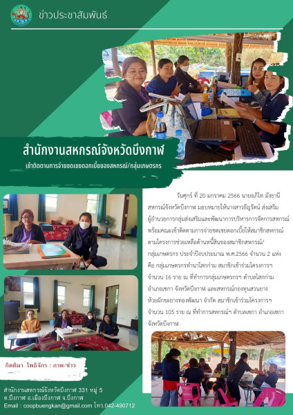 วันศุกร์ ที่ 20 มกราคม 2566 นายอภิไท มังธานี สหกรณ์จังหวัดบึงกาฬ มอบหมายให้นางสาวธัญรัตน์ ส่งเสริม ผู้อำนวยการกลุ่มส่งเสริมและพัฒนาการบริหารการจัดการสหกรณ์ พร้อมคณะเข้าติดตามการจ่ายชดเชยดอกเบี้ยให้สมาชิกสหกรณ์ตามโครงการช่วยเหลือด้านหนี้สินของสมาชิกสหกรณ์/กลุ่มเกษตรกร ประจำปีงบประมาณ พ.ศ.2566 จำนวน 2 แห่ง คือ กลุ่มเกษตรกรทำนาโสกก่าม สมาชิกเข้าร่วมโครงการฯ จำนวน 16 ราย ณ ที่ทำการกลุ่มเกษตรกรฯ ตำบลโสกก่าม อำเภอเซกา จังหวัดบึงกาฬ และสหกรณ์กองทุนสวนยางห้วยผักขะยางทองพัฒนา จำกัด สมาชิกเข้าร่วมโครงการฯ จำนวน 105 ราย ณ ที่ทำการสหกรณ์ฯ ตำบลเซกา อำเภอเซกา จังหวัดบึงกาฬ