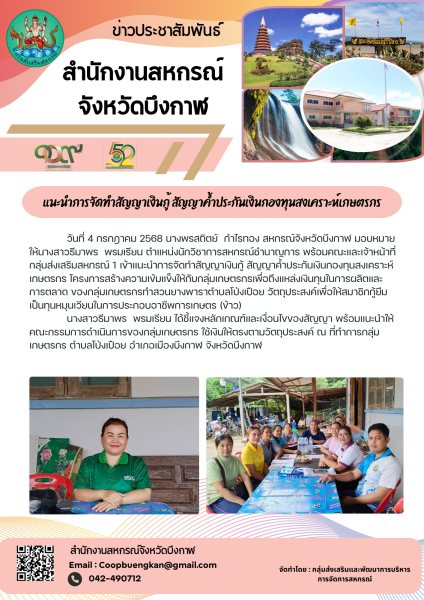 วันที่ 4 กรกฎาคม 2568 นางพรสถิตย์ กำไรทอง สหกรณ์จังหวัดบึงกาฬ มอบหมายให้นางสาวธีมาพร พรมเรียน ตำแหน่งนักวิชาการสหกรณ์ชำนาญการ พร้อมคณะและเจ้าหน้าที่กลุ่มส่งเสริมสหกรณ์ 1 เข้าแนะนำการจัดทำสัญญาเงินกู้ สัญญาค้ำประกันเงินกองทุนสงเคราะห์เกษตรกร โครงการสร้างความเข้มแข็งให้กับกลุ่มเกษตรกรเพื่อถึงแหล่งเงินทุนในการผลิตและการตลาด ของกลุ่มเกษตรกรทำสวนยางพาราตำบลโป่งเปือย วัตถุประสงค์เพื่อให้สมาชิกกู้ยืมเป็นทุนหมุนเวียนในการประกอบอาชีพการเกษตร (ข้าว)
