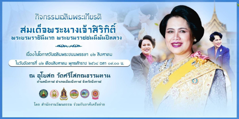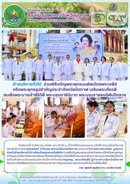 วันอังคารที่ 12 สิงหาคม 2568 เวลา 09.00 น. ที่วัดศรีโสภณธรรมทาน (วัดใต้) อำเภอเมืองบึงกาฬ จังหวัดบึงกาฬ นางพรสถิตย์ กำไรทอง สหกรณ์จังหวัดบึงกาฬ มอบหมายให้นางสาวประภัสสร รูปสอาด หัวหน้าฝ่ายบริหารทั่วไป พร้อมด้วยบุคลากรในสังกัด ร่วมพิธีเจริญพระพุทธมนต์สมโภชพระเจดีย์หรือพระพุทธรูปสำคัญประจำจังหวัดบึงกาฬ เฉลิมพระเกียรติสมเด็จพระนางเจ้าสิริกิติ์ พระบรมราชินีนาถ พระบรมราชชนนีพันปีหลวง จัดโดยสำนักงานวัฒนธรรมจังหวัดบึงกาฬ โดยมีนายจุมพฏ วรรณฉัตรสิริ ผู้ว่าราชการจังหวัดบึงกาฬ เป็นประธานในพิธีพร้อมด้วย หัวหน้าส่วนราชการภาครัฐ และเอกชน และประชาชนทั่วไปร่วมพิธีในครั้งนี้