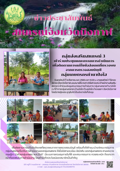 วันพฤหัสบดี ที่ 14 สิงหาคม พ.ศ. 2568 เวลา 10.00 น. นางพรสถิตย์ กำไรทอง สหกรณ์จังหวัดบึงกาฬ มอบหมายให้นางสาวจีรโชติ นิเวศน์ เจ้าพนักงานส่งเสริมสหกรณ์ เข้าร่วมประชุมคณะกรรมการดำเนินการ กลุ่มเกษตรกรทำนาป่งไฮ ณ ที่ทำการกลุ่มเกษตรกรฯ บ้านป่งไฮ ตำบลป่งไฮ อำเภอเซกา จังหวัดบึงกาฬ โดยมีนายสุระเดช บุญรินทร์ เป็นประธานในที่ประชุม เพื่อติดตามการแก้ไขข้อสังเกตที่ตรวจพบจากการตรวจสอบบัญชี พร้อมทั้งให้คำแนะนำแก่คณะกรรมการกลุ่มเกษตรกรเกี่ยวกับการดำเนินงานของกลุ่มเกษตรกร ให้เป็นไปตามระเบียบ ข้อบังคับของกลุ่มเกษตรกร ตามพระราชกฤษฎีกา ว่าด้วยกลุ่มเกษตร พ.ศ.2547 มีระบบการควบคุมภายในที่ดี และคณะกรรมการควรตระหนักถึงบทบาทหน้าที่ของตนในการดำเนินงาน โดยคำนึงถึงประโยชน์ของสมาชิกเป็นสำคัญ