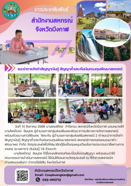 วันที่ 14 สิงหาคม 2568 นางพรสถิตย์ กำไรทอง สหกรณ์จังหวัดบึงกาฬ มอบหมายให้นายไพรโรจน์ ชัยบุตร ผู้อำนวยการกลุ่มส่งเสริมและพัฒนาการบริหารการจัดการสหกรณ์ พร้อมด้วยนางสาวสิริเนตร โพระกัน ผู้อำนวยการกลุ่มส่งเสริมสหกรณ์ 2 เข้าแนะนำการจัดทำสัญญาเงินกู้ สัญญาค้ำประกันเงินกองทุนพัฒนาสหกรณ์ สหกรณ์การเกษตรหนองนาคำ-พัฒนาพร จำกัด วัตถุประสงค์เพื่อให้สมาชิกกู้ยืมเป็นทุนหมุนเวียนในการประกอบอาชีพทางการเกษตร (ยางพารา) ต้นเงินกู้ 1.8 ล้านบาท