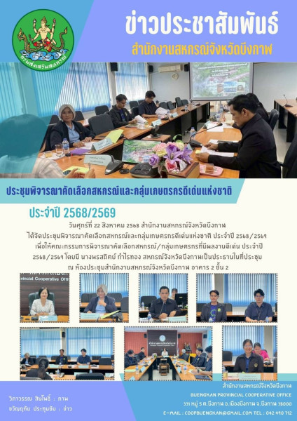 วันศุกร์ที่ 22 สิงหาคม 2568 สำนักงานสหกรณ์จังหวัดบึงกาฬ ได้จัดประชุมพิจารณาคัดเลือกสหกรณ์และกลุ่มเกษตรกรดีเด่นแห่งชาติ ประจำปี 2568/2569 เพื่อให้คณะกรรมการพิจารณาคัดเลือกสหกรณ์/กลุ่มเกษตรกรที่มีผลงานดีเด่น ประจำปี 2568/2569 โดยมี นางพรสถิตย์ กำไรทอง สหกรณ์จังหวัดบึงกาฬเป็นประธานในที่ประชุม ณ ห้องประชุมสำนักงานสหกรณ์จังหวัดบึงกาฬ อาคาร 2 ชั้น 2