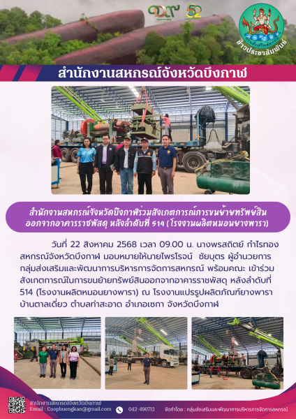 วันที่ 22 สิงหาคม 2568 เวลา 09.00 น. นางพรสถิตย์ กำไรทอง สหกรณ์จังหวัดบึงกาฬ มอบหมายให้นายไพรโรจน์ ชัยบุตร ผู้อำนวยการกลุ่มส่งเสริมและพัฒนาการบริหารการจัดการสหกรณ์ พร้อมคณะ เข้าร่วมสังเกตการณ์ในการขนย้ายทรัพย์สินออกจากอาคารราชพัสดุ หลังลำดับที่ 514 (โรงงานผลิตหมอนยางพารา) ณ โรงงานแปรรูปผลิตภัณฑ์ยางพารา บ้านตาลเดี่ยว ตำบลท่าสะอาด อำเภอเซกา จังหวัดบึงกาฬ