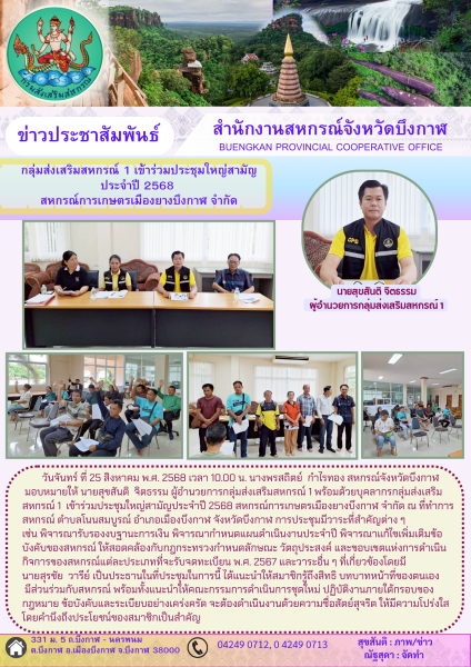 กลุ่มส่งเสริมสหกรณ์ 1 เข้าร่วมประชุมใหญ่สามัญประจำปี 2568 สหกรณ์การเกษตรเมืองยางบึงกาฬ จำกัด เขตพื้นที่อำเภอเมืองบึงกาฬ