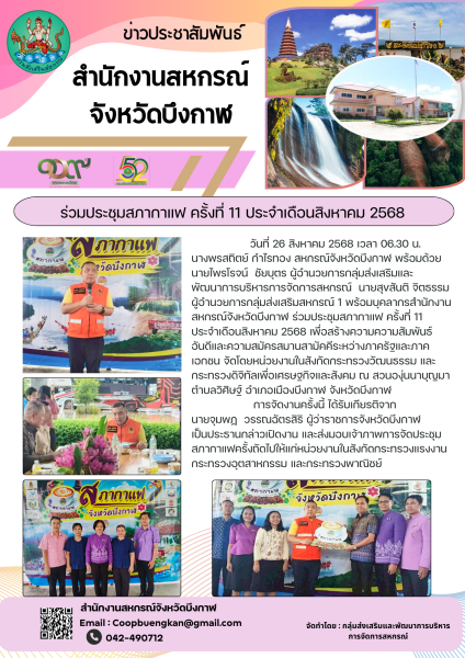 วันที่ 26 สิงหาคม 2568 เวลา 06.30 น. นางพรสถิตย์ กำไรทอง สหกรณ์จังหวัดบึงกาฬ พร้อมด้วยนายไพรโรจน์ ชัยบุตร ผู้อำนวยการกลุ่มส่งเสริมและพัฒนาการบริหารการจัดการสหกรณ์ นายสุขสันติ จิตธรรม ผู้อำนวยการกลุ่มส่งเสริมสหกรณ์ 1 พร้อมบุคลากรสำนักงานสหกรณ์จังหวัดบึงกาฬ ร่วมประชุมสภากาแฟ ครั้งที่ 11 ประจำเดือนสิงหาคม 2568 เพื่อสร้างความความสัมพันธ์อันดีและความสมัครสมานสามัคคีระหว่างภาครัฐและภาคเอกชน จัดโดยหน่วยงานในสังกัดกระทรวงวัฒนธรรม และกระทรวงดิจิทัลเพื่อเศรษฐกิจและสังคม ณ สวนองุ่นนาบุญมา ตำบลวิศิษฐ์ อำเภอเมืองบึงกาฬ จังหวัดบึงกาฬ