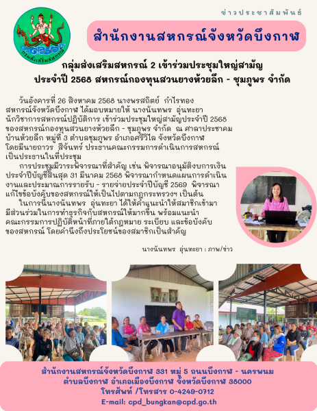 วันอังคารที่ 26 สิงหาคม 2568 นางพรสถิตย์ กำไรทอง สหกรณ์จังหวัดบึงกาฬ ได้มอบหมายให้ นางนันทพร อุ่นทะยา นักวิชาการสหกรณ์ปฏิบัติการ เข้าร่วมประชุมใหญ่สามัญประจำปี 2568 ของสหกรณ์กองทุนสวนยางห้วยลึก - ชุมภูพร จำกัด ณ ศาลาประชาคมบ้านห้วยลึก หมู่ที่ 3 ตำบลชุมภูพร อำเภอศรีวิไล จังหวัดบึงกาฬ โดยมีนายถาวร สีจันทร์ ประธานคณะกรรมการดำเนินการสหกรณ์ เป็นประธานในที่ประชุม