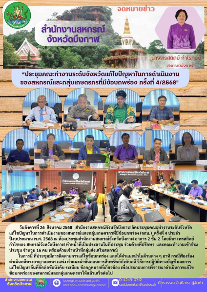 วันที่ 26 สิงหาคม 2568 กลุ่มตรวจสหกรณ์ สำนักงานสหกรณ์จังหวัดบึงกาฬ จัดประชุมคณะทำงานระดับจังหวัดแก้ไขปัญหาในการดำเนินงานของสหกรณ์และกลุ่มเกษตรกรที่มีข้อบกพร่อง (จกบ.) ครั้งที่ 4 ประจำปีงบประมาณ พ.ศ.2568 ณ ห้องประชุมสำนักงานสหกรณ์จังหวัดบึงกาฬ อาคาร 2 ชั้น 2 โดยมีนางพรสถิตย์ กำไรทอง สหกรณ์จังหวัดบึงกาฬ ทำหน้าที่เป็นประธานในที่ประชุม ร่วมด้วยที่ปรึกษาและคณะทำงานเข้าร่วมประชุม จำนวน 16 คน พร้อมด้วยเจ้าหน้าที่กลุ่มส่งเสริมสหกรณ์