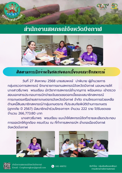 วันที่ 27 สิงหาคม 2568 นายสมพงษ์ บ่าพิมาย ผู้อำนวยการกลุ่มตรวจการสหกรณ์ รักษาราชการแทนสหกรณ์จังหวัดบึงกาฬ มอบหมายให้นางสาวธีมาพร พรมเรียน นักวิชาการสหกรณ์ชำนาญการ พร้อมคณะ เข้าตรวจสอบเอกสารประกอบการเบิกจ่ายเงินชดเชยดอกเบี้ยของสมาชิกสหกรณ์การเกษตรเครือข่ายสภาเกษตรกรจังหวัดบึงกาฬ จำกัด ตามโครงการช่วยเหลือด้านหนี้สินสมาชิกสหกรณ์/กลุ่มเกษตรกร ที่ประสบภัยพิบัติด้านการเกษตร (อุทกภัย ปี 2567) มีสมาชิกเข้าร่วมโครงการฯ จำนวน 222 ราย ได้รับชดเชย จำนวน 266,773.80 บาท