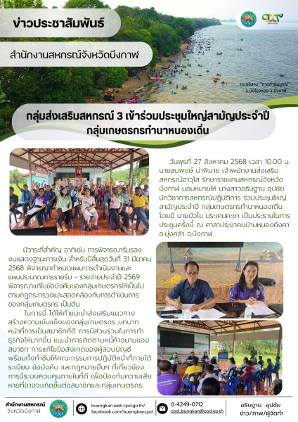 วันพุธที่ 27 สิงหาคม 2568 เวลา 10.00 น. นายสมพงษ์ บ่าพิมาย เจ้าพนักงานส่งเสริมสหกรณ์อาวุโส รักษาราชแทนสหกรณ์จังหวัดบึงกาฬ มอบหมายให้ นางสาวอธิษฐาน อุปชัย นักวิชาการสหกรณ์ปฏิบัติการ ร่วมประชุมใหญ่สามัญประจำปี กลุ่มเกษตรกรทำนาหนองเดิ่น โดยมี นายบัวไข ประเคนคะชา เป็นประธานในการประชุมครั้งนี้ ณ ศาลาประชาคมบ้านหนองคังคา อ.บุ่งคล้า จ.บึงกาฬ มีวาระที่สำคัญ อาทิเช่น การพิจารณารับรอง งบแสดงฐานะการเงิน สำหรับปีสิ้นสุดวันที่ 31 มีนาคม 2568 พิจารณากำหนดแผนการดำเนินงานและแผนประมาณการรายรับ - รายจ่ายประจำปี 2569 พิจารณาแก้ไขข้อบังคับของกลุ่มเกษตรกรให้เป็นไปตามกฎกระทรวงและสอดคล้องกับการดำเนินการของกลุ่มเกษตรกร เป็นต้น