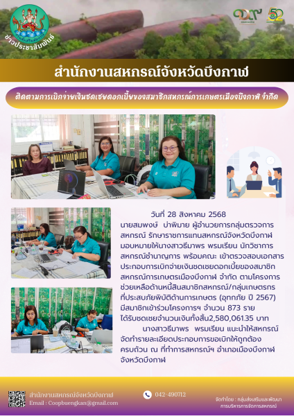 วันที่ 28 สิงหาคม 2568 นายสมพงษ์ บ่าพิมาย ผู้อำนวยการกลุ่มตรวจการสหกรณ์ รักษาราชการแทนสหกรณ์จังหวัดบึงกาฬ มอบหมายให้นางสาวธีมาพร พรมเรียน นักวิชาการสหกรณ์ชำนาญการ พร้อมคณะ เข้าตรวจสอบเอกสารประกอบการเบิกจ่ายเงินชดเชยดอกเบี้ยของสมาชิกสหกรณ์การเกษตรเมืองบึงกาฬ จำกัด ตามโครงการช่วยเหลือด้านหนี้ สินสมาชิกสหกรณ์/กลุ่มเกษตรกร ที่ประสบภัยพิบัติด้านการเกษตร (อุทกภัย ปี 2567) มีสมาชิกเข้าร่วมโครงการฯ จำนวน 873 ราย ได้รับชดเชย จำนวน 2,580,061.35 บาท