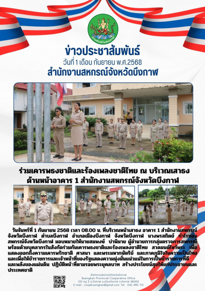 วันจันทร์ที่ 1 กันยายน 2568 เวลา 08.00 น. ที่บริเวณหน้าเสาธง อาคาร 1 สำนักงานสหกรณ์จังหวัดบึงกาฬ ตำบลบึงกาฬ อำเภอเมืองบึงกาฬ จังหวัดบึงกาฬ นางพรสถิตย์ กำไรทอง สหกรณ์จังหวัดบึงกาฬ มอบหมายให้นายสมพงษ์ บ่าพิมาย ผู้อำนวยการกลุ่มตรวจการสหกรณ์ พร้อมด้วยบุคลากรในสังกัด ร่วมกันเคารพธงชาติและร้องเพลงชาติไทย สวดมนต์ไหว้พระ เพื่อแสดงออกถึงความเคารพรักชาติ ศาสนา และพระมหากษัตริย์ และภาคภูมิใจในความเป็นไทย และเพื่อให้ข้าราชการและเจ้าหน้าที่ของรัฐแสดงความมุ่งมั่นแน่วแน่ในการเป็นข้าราชการที่ดี และพลังของแผ่นดิน ปฏิบัติหน้าที่ตามรอยพระยุคลบาท สร้างประโยชน์สุขให้แก่ประชาชนและประเทศชาติ