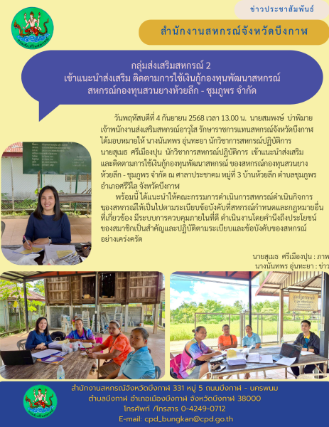 วันพฤหัสบดีที่ 4 กันยายน 2568 เวลา 13.00 น. นายสมพงษ์ บ่าพิมาย เจ้าพนักงานส่งเสริมสหกรณ์อาวุโส รักษาราชการแทนสหกรณ์จังหวัดบึงกาฬ ได้มอบหมายให้ นางนันทพร อุ่นทะยา นักวิชาการสหกรณ์ปฏิบัติการ นายสุเมธ ศรีเมืองปุน นักวิชาการสหกรณ์ปฏิบัติการ เข้าแนะนำส่งเสริม