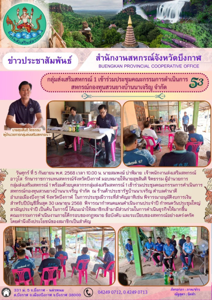 วันศุกร์ ที่ 5 กันยายน พ.ศ. 2568 เวลา 10.00 น. นายสมพงษ์ บ่าพิมาย เจ้าพนักงานส่งเสริมสหกรณ์อาวุโส รักษาราชการแทนสหกรณ์จังหวัดบึงกาฬ มอบหมายให้นายสุขสันติ จิตธรรม ผู้อำนวยการกลุ่มส่งเสริมสหกรณ์ 1 พร้อมด้วยบุคลากรกลุ่มส่งเสริมสหกรณ์ 1 เข้าร่วมประชุมคณะกรรมการดำเนินการ สหกรณ์กองทุนสวนยางบ้านนาเจริญ จำกัด ณ ร้านค้าประชารัฐบ้านนาเจริญ ตำบลคำนาดี อำเภอเมืองบึงกาฬ จังหวัดบึงกาฬ ในการประชุมมีวาระที่สำคัญอาทิเช่น พิจารณาอนุมัติงบการเงินสำหรับปีบัญชีสิ้นสุด 30 เมษายน 2568 พิจารณากำหนดแผนดำเนินงานประจำปี กำหนดวันประชุมใหญ่สามัญประจำปี เป็นต้น ในการนี้ ได้แนะนำให้สมาชิกเข้ามามีส่วนร่วมในการดำเนินธุรกิจให้มากขึ้น คณะกรรมการดำเนินงานภายใต้กรอบของกฎหมาย ข้อบังคับ และระเบียบของสหกรณ์อย่างเคร่งครัดโดยคำนึงถึงประโยชน์ของสมาชิกเป็นสำคัญ