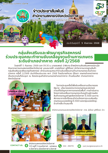 วันศุกร์ที่ 5 กันยายน 2568 เวลา 09.30 น. นายสมพงษ์ บ่าพิมาย เจ้าพนักงานส่งเสริมสหกรณ์อาวุโส รักษาราชการแทนสหกรณ์จังหวัดบึงกาฬ มอบหมายให้ นายรุ่งโรจน์ ชูศิริโรจน์ นักวิชาการมาตรฐานสินค้า กลุ่มส่งเสริมและพัฒนาธุรกิจสหกรณ์ เข้าร่วมประชุมคณะทำงานขับเคลื่อนงานด้านการเกษตรระดับอำเภอปากคาด ครั้งที่ 2/2568 ประจำปีงบประมาณ พ.ศ. 2568 โดยมีนายสำรวย มีจินดา เกษตรอำเภอปากคาด เป็นประธาน ในที่ประชุมฯ ณ ห้องประชุมสำนักงานเกษตรอำเภอปากคาด ตำบลโนนศิลา อำเภอปากคาด จังหวัดบึงกาฬ