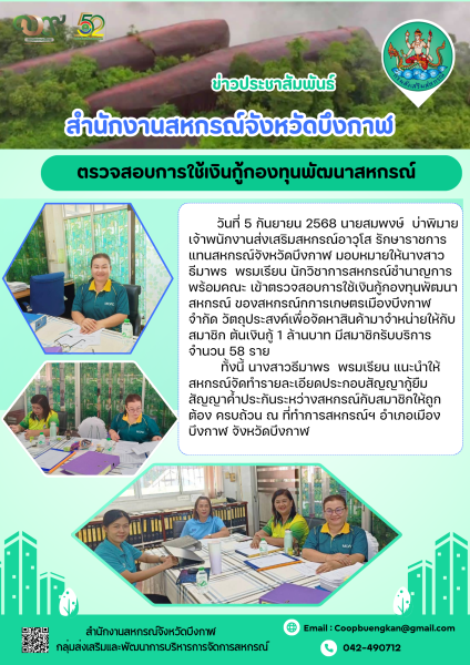 วันที่ 5 กันยายน 2568 นายสมพงษ์ บ่าพิมาย เจ้าพนักงานส่งเสริมสหกรณ์อาวุโส รักษาราชการแทนสหกรณ์จังหวัดบึงกาฬ มอบหมายให้นางสาวธีมาพร พรมเรียน นักวิชาการสหกรณ์ชำนาญการ พร้อมคณะ เข้าตรวจสอบการใช้เงินกู้กองทุนพัฒนาสหกรณ์ ของสหกรณ์การเกษตรเมืองบึงกาฬ จำกัด วัตถุประสงค์เพื่อจัดหาสินค้ามาจำหน่ายให้กับสมาชิก ต้นเงินกู้ 1 ล้านบาท มีสมาชิกรับบริการ จำนวน 58 ราย