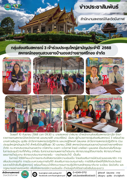 วันพุธที่ 10 กันยายน 2568 เวลา 09.30 น. นายสมพงษ์ บ่าพิมาย เจ้าพนักงานส่งเสริมสหกรณ์อาวุโส รักษาราชการแทนสหกรณ์จังหวัดบึงกาฬ มอบหมายให้ นางนารีรัตน์ มีแสง ผู้อำนวยการกลุ่มส่งเสริมสหกรณ์ 3 พร้อมด้วยนางสาวอธิษฐาน อุปชัย นักวิชาการสหกรณ์ปฏิบัติการ และนายฐิติพงศ์ นิลมงคล นักวิชาการสหกรณ์ปฏิบัติการ ร่วมประชุมใหญ่สามัญประจำปี สำหรับปีบัญชีสิ้นสุด 30 เมษายน 2568 สหกรณ์กองทุนสวนยางบ้านดงสว่างยางศรีทอง จำกัด ณ ศาลาประชาคมบ้านดงสว่าง ต.โสกก่าม อ.เซกา จ.บึงกาฬ โดยมี นายไชยา บุษมงคล เป็นประธานในที่ประชุม ในการประชุมมีวาระที่สำคัญ อาทิเช่น รับทราบรายงานผลการดำเนินงาน พิจารณาอนุมัติงบการเงิน พิจารณากำหนดแผนการดำเนินงาน พิจารณาประมาณการรายรับ - รายจ่ายประจำปี เป็นต้น