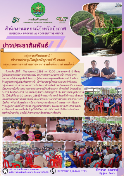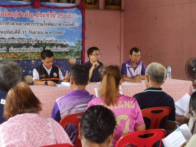 วันพฤหัสบดี ที่ 11 กันยายน พ.ศ. 2568 เวลา 10.00 น. นายสมพงษ์ บ่าพิมาย ผู้อำนวยการกลุ่มตรวจการสหกรณ์ รักษาราชการแทนสหกรณ์จังหวัดบึงกาฬ มอบหมายให้ นายสุขสันติ จิตธรรม ผู้อำนวยการกลุ่มส่งเสริมสหกรณ์ 1 พร้อมด้วยบุคลากรกลุ่มส่งเสริมสหกรณ์ 1 เข้าร่วมประชุมใหญ่สามัญประจำปี 2568 กลุ่มเกษตรกรทำสวนยางพาราร่วมใจพัฒนาตำบลไคสี โดยมีนายณรงชัย ระดาบุตร เป็นประธานในที่ประชุม ณ ศาลาประชาคมบ้านท่าสะอาด ตำบลไคสี อำเภอเมืองบึงกาฬ จังหวัดบึงกาฬ ในการประชุมมีวาระที่สำคัญอาทิ เช่น พิจารณาอนุมัติงบการเงิน (ปีบัญชีสิ้นสุด 30 เมษายน 2568) พิจารณาจัดสรรกำไรสุทธิ พิจารณากำหนดแผนการดำเนินงานของสหกรณ์และพิจารณาประมาณการรายรับ-รายจ่ายประจำปี เป็นต้น