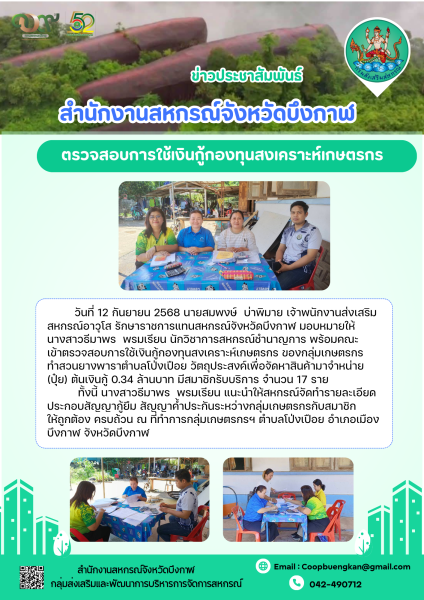 วันที่ 12 กันยายน 2568 นายสมพงษ์ บ่าพิมาย เจ้าพนักงานส่งเสริมสหกรณ์อาวุโส รักษาราชการแทนสหกรณ์จังหวัดบึงกาฬ มอบหมายให้นางสาวธีมาพร พรมเรียน นักวิชาการสหกรณ์ชำนาญการ พร้อมคณะ เข้าตรวจสอบการใช้เงินกู้กองทุนสงเคราะห์เกษตรกร ของกลุ่มเกษตรกรทำสวนยางพาราตำบลโป่งเปือย วัตถุประสงค์เพื่อจัดหาสินค้ามาจำหน่าย (ปุ๋ย) ต้นเงินกู้ 0.34 ล้านบาท มีสมาชิกรับบริการ จำนวน 17 ราย
