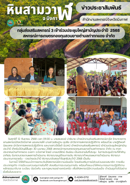 วันศุกร์ที่ 12 กันยายน 2568 เวลา 09.30 น. นายสมพงษ์ บ่าพิมาย เจ้าพนักงานส่งเสริมสหกรณ์อาวุโส รักษาราชการแทนสหกรณ์จังหวัดบึงกาฬ มอบหมายให้ นางสาวอธิษฐาน อุปชัย นักวิชาการสหกรณ์ปฏิบัติการ พร้อมด้วย นายฐิติพงศ์ นิลมงคล นักวิชาการสหกรณ์ปฏิบัติการ และนางสาวจีรโชติ นิเวศน์ เจ้าพนักงานส่งเสริมสหกรณ์ เข้าร่วมประชุมใหญ่สามัญประจำปี สำหรับปีบัญชีสิ้นสุด 30 เมษายน 2568 สหกรณ์การเกษตรกองทุนสวนยางตำบลท่ากกแดง จำกัด ณ ศาลาประชาคมบ้านท่ากกแดง อ.เซกา จ.บึงกาฬ โดยมี นางมณีรัตน์ อินอ่อน เป็นประธานในที่ประชุม ในการประชุมมีวาระที่สำคัญ อาทิเช่น รับทราบรายงานผลการดำเนินงาน พิจารณาอนุมัติงบการเงิน พิจารณากำหนดแผนการดำเนินงาน พิจารณาประมาณการรายรับ - รายจ่ายประจำปี พิจารณาการจัดสรรกำไรสุทธิประจำปี 2568 เป็นต้น