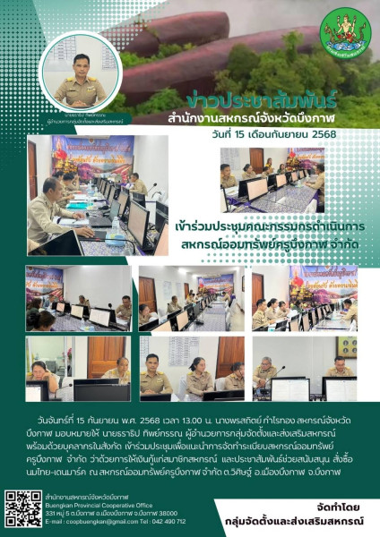 วันจันทร์ที่ 15 กันยายน พ.ศ. 2568 เวลา 13.00 น. นางพรสถิตย์ กำไรทอง สหกรณ์จังหวัดบึงกาฬมอบหมายให้ นายธราธิป ทิพย์กรรณ ผู้อำนวยการกลุ่มจัดตั้งและส่งเสริมสหกรณ์ พร้อมด้วยบุคลากรในสังกัดเข้าร่วมประชุมเพื่อแนะนำการจัดทำระเบียบสหกรณ์ออมทรัพย์ครูบึงกาฬ จำกัด ว่าด้วยการให้เงินกู้แก่สมาชิกสหกรณ์ และประชาสัมพันธ์ช่วยสนับสนุน สั่งซื้อ นมไทย-เดนมาร์ค ณ สหกรณ์ออมทรัพย์ครูบึงกาฬ จำกัด ต.วิศิษฐ์ อ.เมืองบึงกาฬ จ.บึงกาฬ