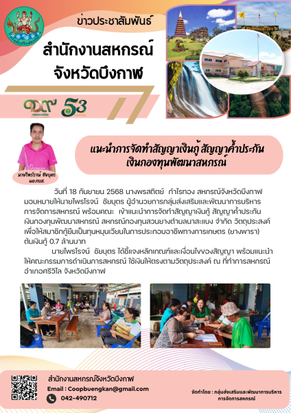 วันที่ 18 กันยายน 2568 นางพรสถิตย์ กำไรทอง สหกรณ์จังหวัดบึงกาฬ มอบหมายให้นายไพรโรจน์ ชัยบุตร ผู้อำนวยการกลุ่มส่งเสริมและพัฒนาการบริหารการจัดการสหกรณ์ พร้อมคณะ เข้าแนะนำการจัดทำสัญญาเงินกู้ สัญญาค้ำประกันเงินกองทุนพัฒนาสหกรณ์ สหกรณ์กองทุนสวนยางตำบลนาสะแบง จำกัด วัตถุประสงค์เพื่อให้สมาชิกกู้ยืมเป็นทุนหมุนเวียนในการประกอบอาชีพทางการเกษตร (ยางพารา) ต้นเงินกู้ 0.7 ล้านบาท