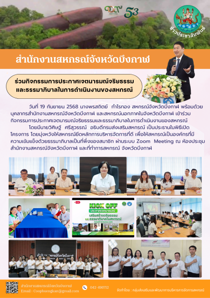 วันที่ 19 กันยายน 2568 นางพรสถิตย์ กำไรทอง สหกรณ์จังหวัดบึงกาฬ พร้อมด้วยบุคลากรสำนักงานสหกรณ์จังหวัดบึงกาฬ และสหกรณ์นอกภาคในจังหวัดบึงกาฬ เข้าร่วมกิจกรรมการประกาศเจตนารมณ์จริยธรรมและธรรมาภิบาลในการดำเนินงานของสหกรณ์ โดยมีนายวิศิษฐ์ ศรีสุวรรณ์ อธิบดีกรมส่งเสริมสหกรณ์ เป็นประธานในพิธีเปิดโครงการ โดยมุ่งหวังให้สหกรณ์ยึดหลักการบริหารจัดการที่ดี เพื่อให้สหกรณ์เป็นองค์กรที่มีความเข้มแข็งด้วยธรรมาภิบาลเป็นที่พึ่งของสมาชิก ผ่านระบบ Zoom Meeting ณ ห้องประชุมสำนักงานสหกรณ์จังหวัดบึงกาฬ และที่ทำการสหกรณ์ จังหวัดบึงกาฬ