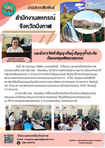 วันที่ 19 กันยายน 2568 นางพรสถิตย์ กำไรทอง สหกรณ์จังหวัดบึงกาฬ มอบหมายให้นางสาวธีมาพร พรมเรียน นักวิชาการสหกรณ์ชำนาญการ พร้อมเจ้าหน้าที่กลุ่มส่งเสริมสหกรณ์ 3 เข้าแนะนำการจัดทำสัญญาเงินกู้ สัญญาค้ำประกันเงินกองทุนพัฒนาสหกรณ์ของสหกรณ์การเกษตรมหาชนท่าสะอาด จำกัด วัตถุประสงค์เพื่อให้สมาชิกกู้ยืมเป็นทุนหมุนเวียนในการประกอบอาชีพทางการเกษตร (ยางพารา) ต้นเงินกู้ 4.5 ล้านบาท และสหกรณ์การเกษตรกองทุนสวนยางตำบลท่ากกแดง จำกัด ต้นเงินกู้ 1.2 ล้านบาท