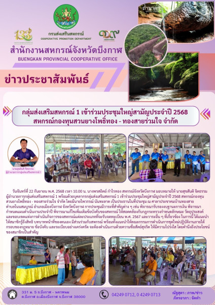 วันจันทร์ที่ 22 กันยายน พ.ศ. 2568 เวลา 10.00 น. นางพรสถิตย์ กำไรทอง สหกรณ์จังหวัดบึงกาฬ มอบหมายให้ นายสุขสันติ จิตธรรม ผู้อำนวยการกลุ่มส่งเสริมสหกรณ์ 1 พร้อมด้วยบุคลากรกลุ่มส่งเสริมสหกรณ์ 1 เข้าร่วมประชุมใหญ่สามัญประจำปี 2568 สหกรณ์กองทุนสวนยางโพธิ์ทอง - ทองสายร่วมใจ จำกัด โดยมีนายไพวรรณ์ นันทะลาด เป็นประธานในที่ประชุม ณ ศาลาประชาคมบ้านทองสาย ตำบลโนนสมบูรณ์ อำเภอเมืองบึงกาฬ จังหวัดบึงกาฬ การประชุมมีวาระที่สำคัญต่าง ๆ เช่น พิจารณารับรองงบฐานะการเงิน พิจารณากำหนดแผนดำเนินงานประจำปี พิจารณาแก้ไขเพิ่มเติมข้อบังคับของสหกรณ์ ให้สอดคล้องกับกฎกระทรวงกำหนดลักษณะ วัตถุประสงค์ และขอบเขตแห่งการดำเนินกิจการของสหกรณ์แต่ละประเภทที่จะรับจดทะเบียน พ.ศ. 2567 และวาระอื่น ๆ ที่เกี่ยวข้อง