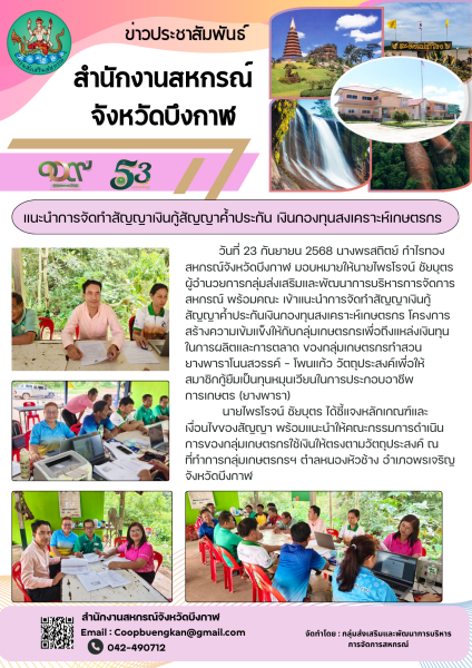 วันที่ 23 กันยายน 2568 นางพรสถิตย์ กำไรทอง สหกรณ์จังหวัดบึงกาฬ มอบหมายให้นายไพรโรจน์ ชัยบุตร ผู้อำนวยการกลุ่มส่งเสริมและพัฒนาการบริหารการจัดการสหกรณ์ พร้อมคณะ เข้าแนะนำการจัดทำสัญญาเงินกู้สัญญาค้ำประกันเงินกองทุนสงเคราะห์เกษตรกร โครงการสร้างความเข้มแข็งให้กับกลุ่มเกษตรกรเพื่อถึงแหล่งเงินทุนในการผลิตและการตลาด ของกลุ่มเกษตรกรทำสวนยางพาราโนนสวรรค์ - โพนแก้ว วัตถุประสงค์เพื่อให้สมาชิกกู้ยืมเป็นทุนหมุนเวียนในการประกอบอาชีพการเกษตร (ยางพารา)