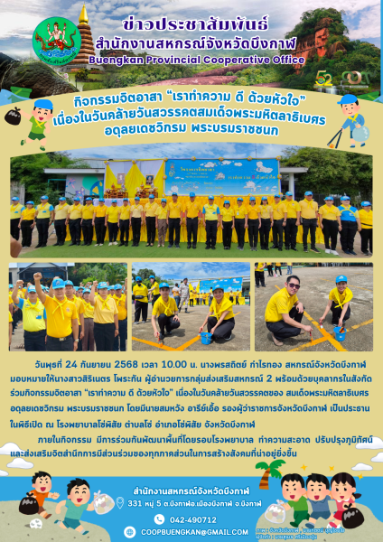 วันพุธที่ 24 กันยายน 2568 เวลา 10.00 น. นางพรสถิตย์ กำไรทอง สหกรณ์จังหวัดบึงกาฬ มอบหมายให้นางสาวสิริเนตร โพระกัน ผู้อำนวยการกลุ่มส่งเสริมสหกรณ์ 2 พร้อมด้วยบุคลากรในสังกัด ร่วมกิจกรรมจิตอาสา “เราทำความ ดี ด้วยหัวใจ” เนื่องในวันคล้ายวันสวรรคตของ สมเด็จพระมหิตลาธิเบศร อดุลยเดชวิกรม พระบรมราชชนก โดยมีนายสมหวัง อารีย์เอื้อ รองผู้ว่าราชการจังหวัดบึงกาฬ เป็นประธานในพิธีเปิด ณ โรงพยาบาลโซ่พิสัย ตำบลโซ่ อำเภอโซ่พิสัย จังหวัดบึงกาฬ