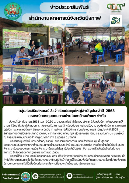 กลุ่มส่งเสริมสหรกณ์ 3 ร่วมประชุมใหญ่สามัญประจำปี 2568 สหกรณ์กองทุนสวนยางโคกกว้างพัฒนา จำกัด ณ ศาลาประชาคมบ้านบึงสำราญ ต. โคกกว้าง อ.บุ่งคล้า จ.บึงกาฬ