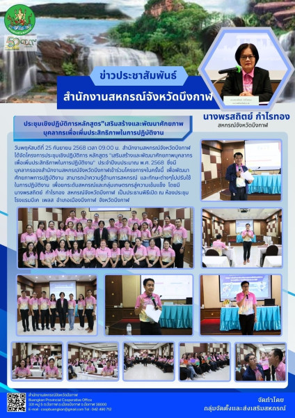 สหกรณ์จังหวัดบึงกาฬ เป็นประธานเปิดโครงการประชุมเชิงปฏิบัติการ หลักสูตร "เสริมสร้างและพัฒนาศักยภาพบุคลากร เพื่อเพิ่มประสิทธิภาพในการปฏิบัติงาน" ประจำปีงบประมาณ พ.ศ. 2568