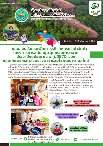 วันศุกร์ที่ 26 กันยายน 2568 นางพรสถิตย์ กำไรทอง สหกรณ์จังหวัดบึงกาฬ มอบหมายให้นางสาวจิตรานุช เหมืองหม้อ นักวิชาการสหกรณ์ปฏิบัติการ พร้อมด้วยนายรุ่งโรจน์ ชูศิริโรจน์ นักวิชาการมาตรฐานสินค้า กลุ่มส่งเสริมและพัฒนาธุรกิจสหกรณ์ เข้าจัดทำโครงการสนับสนุนอุปกรณ์การตลาด ประจำปีงบประมาณ พ.ศ. 2570 ของกลุ่มเกษตรกรทำสวนยางพาราร่วมใจพัฒนาตำบลไคสี ณ ที่ทำการกลุ่มเกษตรกรฯ ต.ไคสี อ.เมืองบึงกาฬ จ.บึงกาฬ เพื่อส่งเสริมส่งเสริมสถาบันเกษตรกรให้เป็นผู้บริการทางการเกษตรแบบครบวงจร โดยคัดเลือกจากสหกรณ์/กลุ่มเกษตรกรที่มีความเข้มแข็ง ความพร้อม วัตถุประสงค์ และโครงการที่ชัดเจน รวมถึงมีคุณสมบัติ และหลักเกณฑ์ที่ ครบถ้วนในการขอรับงบประมาณ โดยทางกลุ่มเกษตรกรฯ จัดทำโครงการฯเพื่อขอรับสนับสนุนโรงบ่มยางก้อนถ้วยเพื่อชลอการขายยางก้อนถ้วย ขนาดกว้าง 8 เมตร ยาว 18 เมตร พื้นที่ใช้สอยไม่น้อยกว่า 144 ตารางเมตร