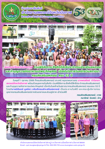วันพุธที่ 1 ตุลาคม 2568 ที่กรมส่งเสริมสหกรณ์ เทเวศร์ กรุงเทพมหานคร นางพรสถิตย์ กำไรทอง สหกรณ์จังหวัดบึงกาฬ พร้อมด้วยบุคลากรในสังกัด ร่วมพิธีสักการะสิ่งศักดิ์สิทธิ์ประจำกรมส่งเสริมสหกรณ์ และทำบุญถวายภัตตาหารแด่พระภิกษุสงฆ์ เนื่องในวันคล้ายวันสถาปนากรมส่งเสริมสหกรณ์ ครบรอบ 53 ปี โดยมี นายนิรันดร์ มูลธิดา อธิบดีกรมส่งเสริมสหกรณ์ เป็นประธานในพิธี และคณะผู้บริหารกรม บุคลากรกรมส่งเสริมสหกรณ์จากส่วนกลางและส่วนภูมิภาค เข้าร่วมพิธี