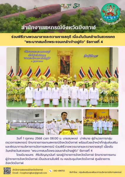 วันที่ 1 ตุลาคม 2568 เวลา 08.00 น. นายสมพงษ์ บ่าพิมาย ผู้อำนวยการกลุ่มตรวจการสหกรณ์ รักษาราชการแทนสหกรณ์จังหวัดบึงกาฬ พร้อมด้วยเจ้าหน้าที่กลุ่มส่งเสริมและพัฒนาการบริหารการจัดการสหกรณ์ ร่วมพิธีวางพวงมาลาและถวายราชสดุดี เนื่องในวันคล้ายวันสวรรคต "พระบาทสมเด็จพระจอมเกล้าเจ้าอยู่หัว" รัชกาลที่ 4 โดยมีนายนคร ศิริปริญญานันท์ รองผู้ว่าราชการจังหวัดบึงกาฬ รักษาราชการแทนผู้ว่าราชการจังหวัดบึงกาฬ เป็นประธานในพิธี ณ หอประชุมจังหวัดบึงกาฬ ศูนย์ราชการจังหวัดบึงกาฬ
