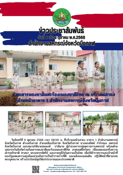 วันจันทร์ที่ 6 ตุลาคม 2568 เวลา 08.00 น. ที่บริเวณหน้าเสาธง อาคาร 1 สำนักงานสหกรณ์จังหวัดบึงกาฬ ตำบลบึงกาฬ อำเภอเมืองบึงกาฬ จังหวัดบึงกาฬ นางพรสถิตย์ กำไรทอง สหกรณ์จังหวัดบึงกาฬ มอบหมายให้นายสมพงษ์ บ่าพิมาย ผู้อำนวยการกลุ่มตรวจการสหกรณ์ พร้อมด้วยบุคลากรในสังกัดร่วมกันเคารพธงชาติและร้องเพลงชาติไทย สวดมนต์ไหว้พระ เพื่อแสดงออกถึงความเคารพรักชาติ ศาสนา พระมหากษัตริย์ และภาคภูมิใจในความเป็นไทย เพื่อให้ข้าราชการและเจ้าหน้าที่ของรัฐแสดงความมุ่งมั่นแน่วแน่ในการเป็นข้าราชการที่ดี และพลังของแผ่นดิน ปฏิบัติหน้าที่ตามรอยพระยุคลบาท สร้างประโยชน์สุขให้แก่ประชาชนและประเทศชาติ