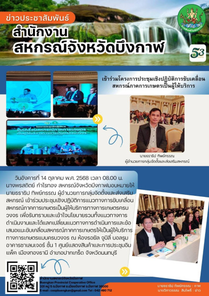 วันอังคารที่ 14 ตุลาคม พ.ศ. 2568 เวลา 08.00 น. นางพรสถิตย์ กำไรทอง สหกรณ์จังหวัดบึงกาฬมอบหมายให้ นายธราธิป ทิพย์กรรณ ผู้อำนวยการกลุ่มจัดตั้งและส่งเสริมสหกรณ์ เข้าร่วมประชุมเชิงปฏิบัติการแนวทางการขับเคลื่อนสหกรณ์ภาคการเกษตรเป็นผู้ให้บริการทางการเกษตรครบวงจร เพื่อรับทราบและเข้าใจนโยบายรวมทั้งแนวทางการดำเนินงานและได้แลกเปลี่ยนแนวทางการดำเนินการและข้อเสนอแนะขับเคลื่อนสหกรณ์ภาคการเกษตรให้เป็นผู้ให้บริการทางการเกษตรแบบครบวงจร ณ ห้องรอยัล จูบิลี่ บอลรูม อาคารชาเลนเจอร์ ชั้น 1 ศูนย์แสดงสินค้าและการประชุมอิมแพ็ค เมืองทองธานี อำเภอปากเกร็ด จังหวัดนนทบุรี