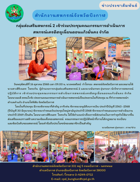 วันพฤหัสบดีที่ 16 ตุลาคม 2568 เวลา 09.00 น. นางพรสถิตย์ กำไรทอง สหกรณ์จังหวัดบึงกาฬ มอบหมายให้นางสาวสิริเนตร โพระกัน ผู้อำนวยการกลุ่มส่งเสริมสหกรณ์ 2 และนางนันทพร อุ่นทะยา นักวิชาการสหกรณ์ปฏิบัติการ เข้าร่วมประชุมคณะกรรมการดำเนินการสหกรณ์เครดิตยูเนี่ยนดอนแก้วมั่นคง จำกัด โดยนางมะลิ ธรรมโกรัง ประธานคณะกรรมการดำเนินการสหกรณ์เป็นประธานในที่ประชุม ณ ที่ทำการสหกรณ์ฯ ตำบลคำแก้ว อำเภอโซ่พิสัย จังหวัดบึงกาฬ