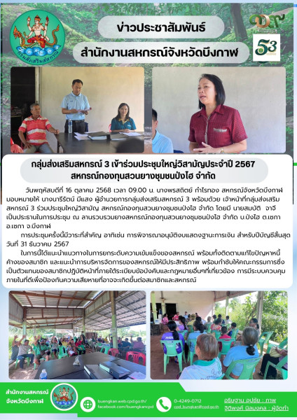วันพฤหัสบดีที่ 16 ตุลาคม 2568 เวลา 09.00 น. นางพรสถิตย์ กำไรทอง สหกรณ์จังหวัดบึงกาฬ มอบหมายให้ นางนารีรัตน์ มีแสง ผู้อำนวยการกลุ่มส่งเสริมสหกรณ์ 3 พร้อมด้วย เจ้าหน้าที่กลุ่มส่งเสริมสหกรณ์ 3 ร่วมประชุมใหญ่วิสามัญ สหกรณ์กองทุนสวนยางชุมชนป่งไฮ จำกัด โดยมี นายสมบัติ จาจี เป็นประธานในการประชุม ณ ลานรวบรวมยางสหกรณ์กองทุนสวนยางชุมชนป่งไฮ จำกัด บ.ป่งไฮ ต.เซกา อ.เซกา จ.บึงกาฬ