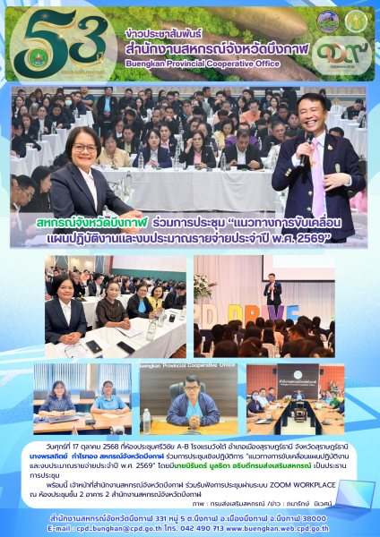 วันศุกร์ที่ 17 ตุลาคม 2568 ที่ห้องประชุมศรีวิชัย A-B โรงแรมวังใต้ อำเภอเมืองสุราษฎร์ธานี จังหวัดสุราษฎร์ธานี นางพรสถิตย์ กำไรทอง สหกรณ์จังหวัดบึงกาฬ ร่วมการประชุมเชิงปฏิบัติการ “แนวทางการขับเคลื่อนแผนปฏิบัติงานและงบประมาณรายจ่ายประจำปี พ.ศ. 2569” โดยมีนายนิรันดร์ มูลธิดา อธิบดีกรมส่งเสริมสหกรณ์ เป็นประธานการประชุม