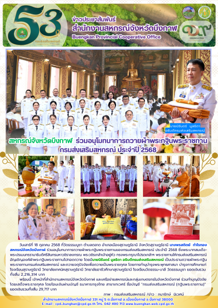 พร้อมนี้ เจ้าหน้าที่สำนักงานสหกรณ์จังหวัดบึงกาฬ และเครือข่ายสหกรณ์และกลุ่มเกษตรกรในจังหวัดบึงกาฬ ร่วมทำบุญปัจจัยโดยเสด็จพระราชกุศล โดยโอนเงินผ่านบัญชี ธนาคารกรุงไทย สาขาเทเวศร์ ชื่อบัญชี "กรมส่งเสริมสหกรณ์ (กฐินพระราชทาน)" ยอดเงินรวมทั้งสิ้น 29,717 บาท
