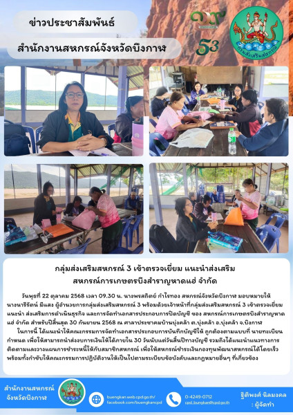 วันพุธที่ 22 ตุลาคม 2568 เวลา 09.30 น. นางพรสถิตย์ กำไรทอง สหกรณ์จังหวัดบึงกาฬ มอบหมายให้ นางนารีรัตน์ มีแสง ผู้อำนวยการกลุ่มส่งเสริมสหกรณ์ 3 พร้อมด้วยเจ้าหน้าที่กลุ่มส่งเสริมสหกรณ์ 3 เข้าตรวจเยี่ยม แนะนำ ส่งเสริมการดำเนินธุรกิจ และการจัดทำเอกสารประกอบการปิดบัญชี ของ สหกรณ์การเกษตรบึงสำราญหาดแฮ่ จำกัด สำหรับปีสิ้นสุด 30 กันยายน 2568 ณ ศาลาประชาคมบ้านบุ่งคล้า ต.บุ่งคล้า อ.บุ่งคล้า จ.บึงกาฬ