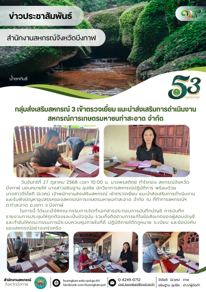 วันจันทร์ที่ 27 ตุลาคม 2568 เวลา 10.00 น. นางพรสถิตย์ กำไรทอง สหกรณ์จังหวัดบึงกาฬ มอบหมายให้ นางสาวอธิษฐาน อุปชัย นักวิชาการสหกรณ์ปฏิบัติการ พร้อมด้วย นางสาวจีรโชติ นิเวศน์ เจ้าพนักงานส่งเสริมสหกรณ์ เข้าตรวจเยี่ยม แนะนำส่งเสริมการดำเนินงาน และรับฟังปัญหาอุปสรรคของสหกรณ์การเกษตรมหาชนท่าสะอาด จำกัด ณ ที่ทำการสหกรณ์ฯ ต.ท่าสะอาด อ.เซกา จ.บึงกาฬ