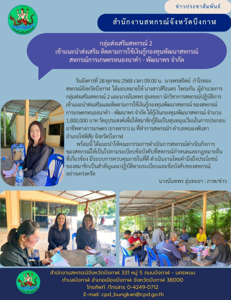 วันอังคารที่ 28 ตุลาคม 2568 เวลา 09.00 น. นางพรสถิตย์ กำไรทอง สหกรณ์จังหวัดบึงกาฬ ได้มอบหมายให้ นางสาวสิริเนตร โพระกัน ผู้อำนวยการกลุ่มส่งเสริมสหกรณ์ 2 และนางนันทพร อุ่นทะยา นักวิชาการสหกรณ์ปฏิบัติการ เข้าแนะนำส่งเสริมและติดตามการใช้เงินกู้กองทุนพัฒนาสหกรณ์ ของสหกรณ์การเกษตรหนองนาคำ - พัฒนาพร จำกัด ได้กู้เงินกองทุนพัฒนาสหกรณ์ จำนวน 1,800,000 บาท วัตถุประสงค์เพื่อให้สมาชิกกู้ยืมเป็นทุนหมุนเวียนในการประกอบอาชีพทางการเกษตร (ยางพารา) ณ ที่ทำการสหกรณ์ฯ ตำบลหนองพันทา อำเภอโซ่พิสัย จังหวัดบึงกาฬ
